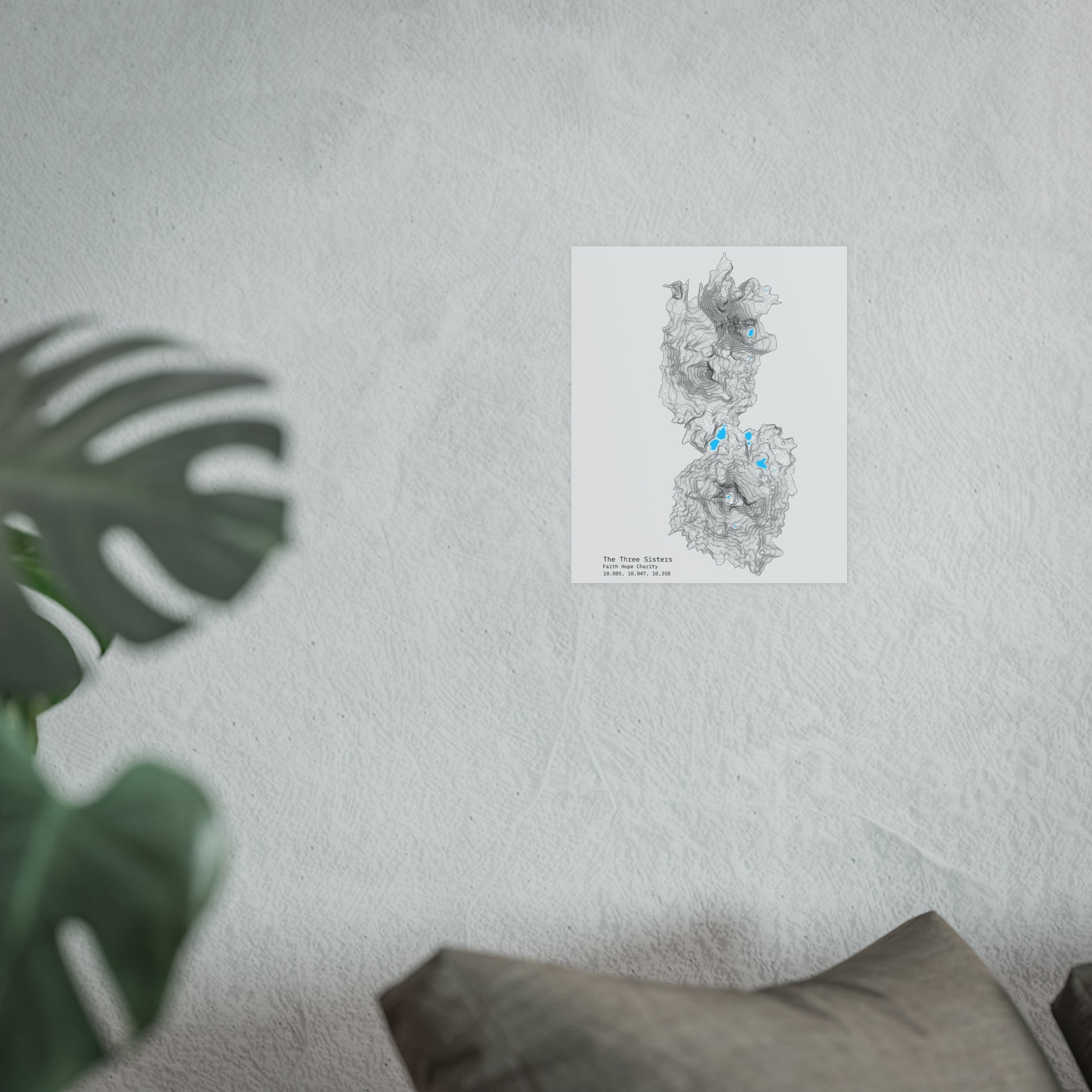 Geographic Art Print, Elegant Map Decor, Modern Home Decor, Unique Wall Art, Gift for Nature Lovers, Three Sisters Topo